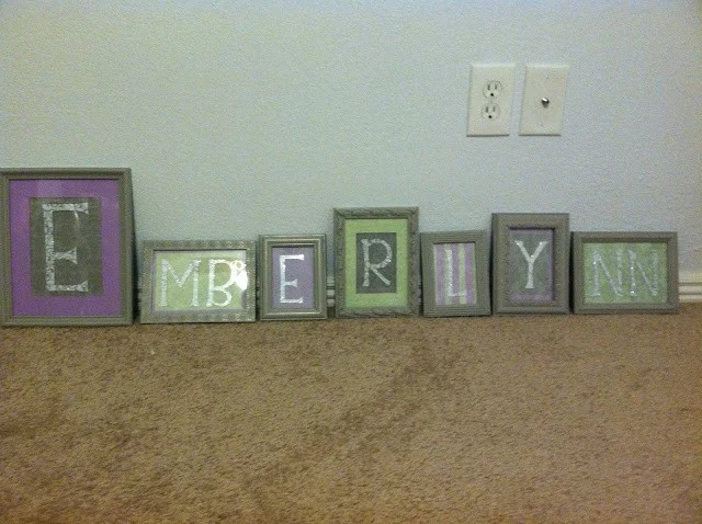 | Her beautiful name…goodwill frames upcycled with some fancy scrapbooking paper from Michael’s and my Cricut |
