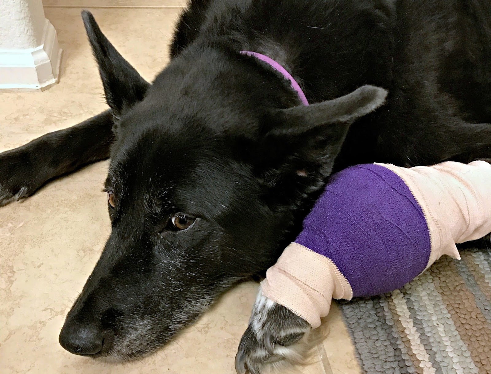 In April or May (I cannot remember) our Mia came running in from outside and slipped on our tile floor and took a bad fall. She started limping about a week later but it appeared that her shoulder was just in pain. We took her to the vet and they agreed.