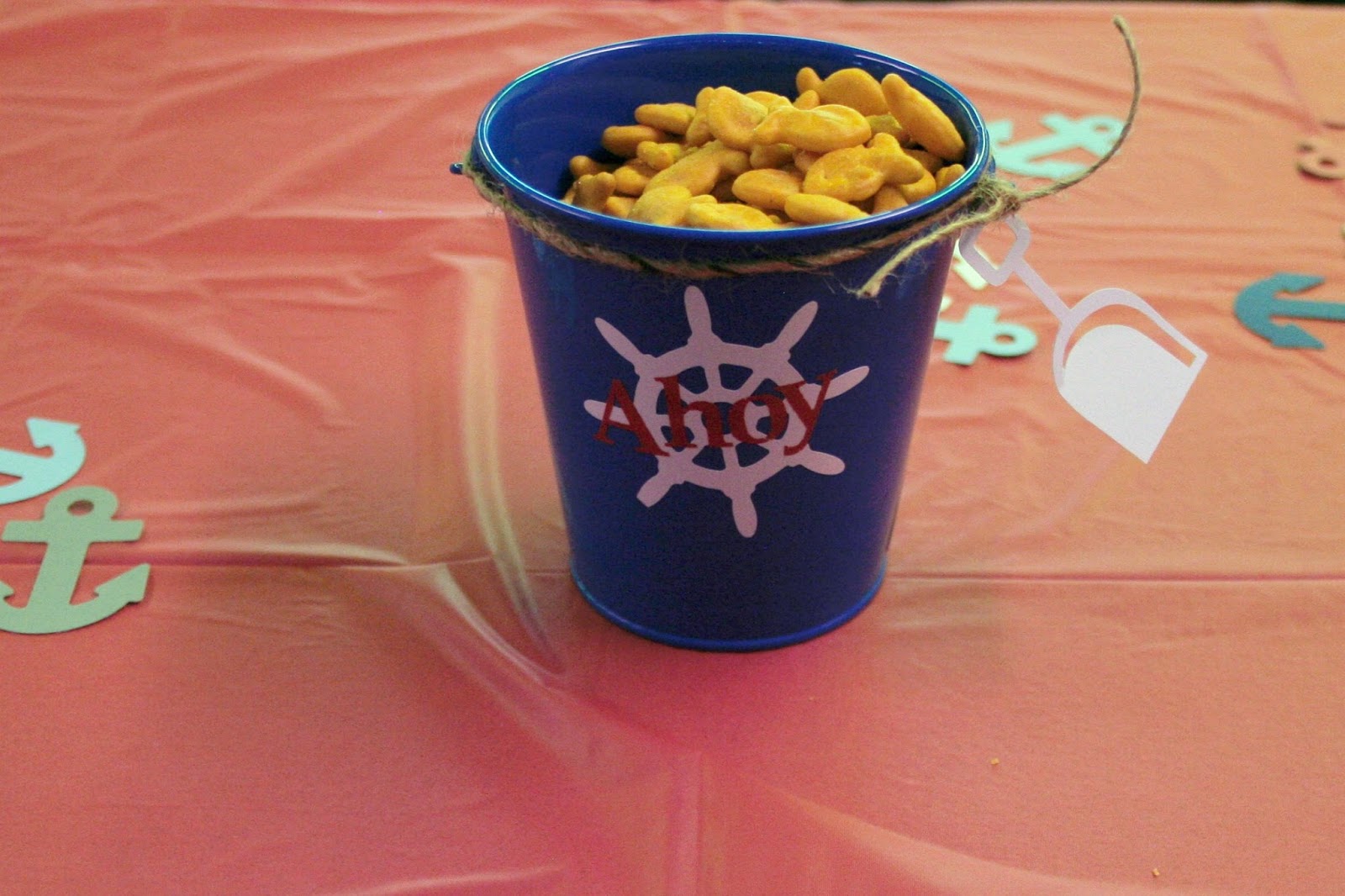 For the table centerpieces I used my Silhouette machine to cut out some nautical vinyl and then cut the shovels out of card stock and attached both to the metal buckets. We filled each bucket with goldfish and chips and then put them on the center of the table with a bunch of anchor punch out confetti.