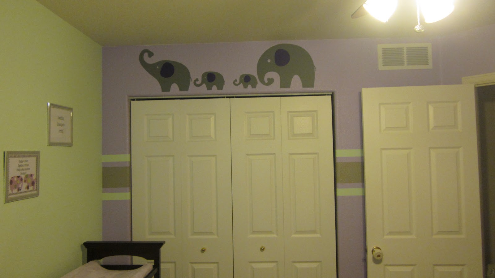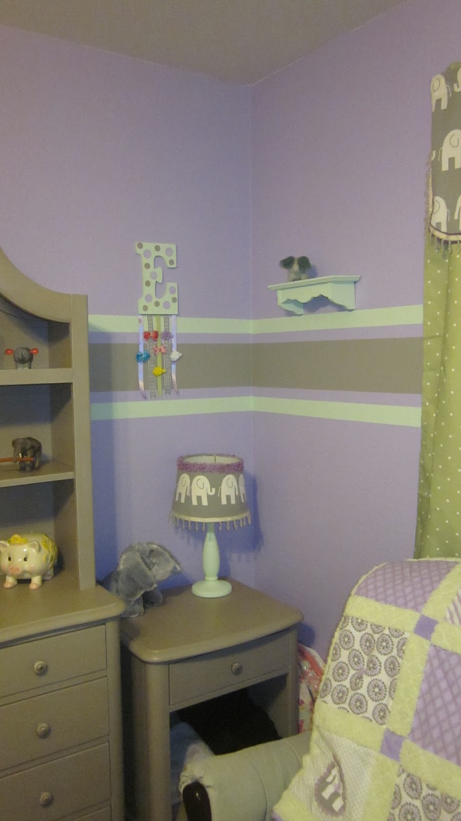 The nursery was inspired by two things; 1. The beautiful grey bedroom set that I fell in love with and 2. My late mother-in-laws LOVE for elephants. One wall in the nursery was already green and I had another gallon of that so I stuck with grey and green and just added purple. I did some projects inspired by Pinterest and really made her room even more perfect than I could even imagine!