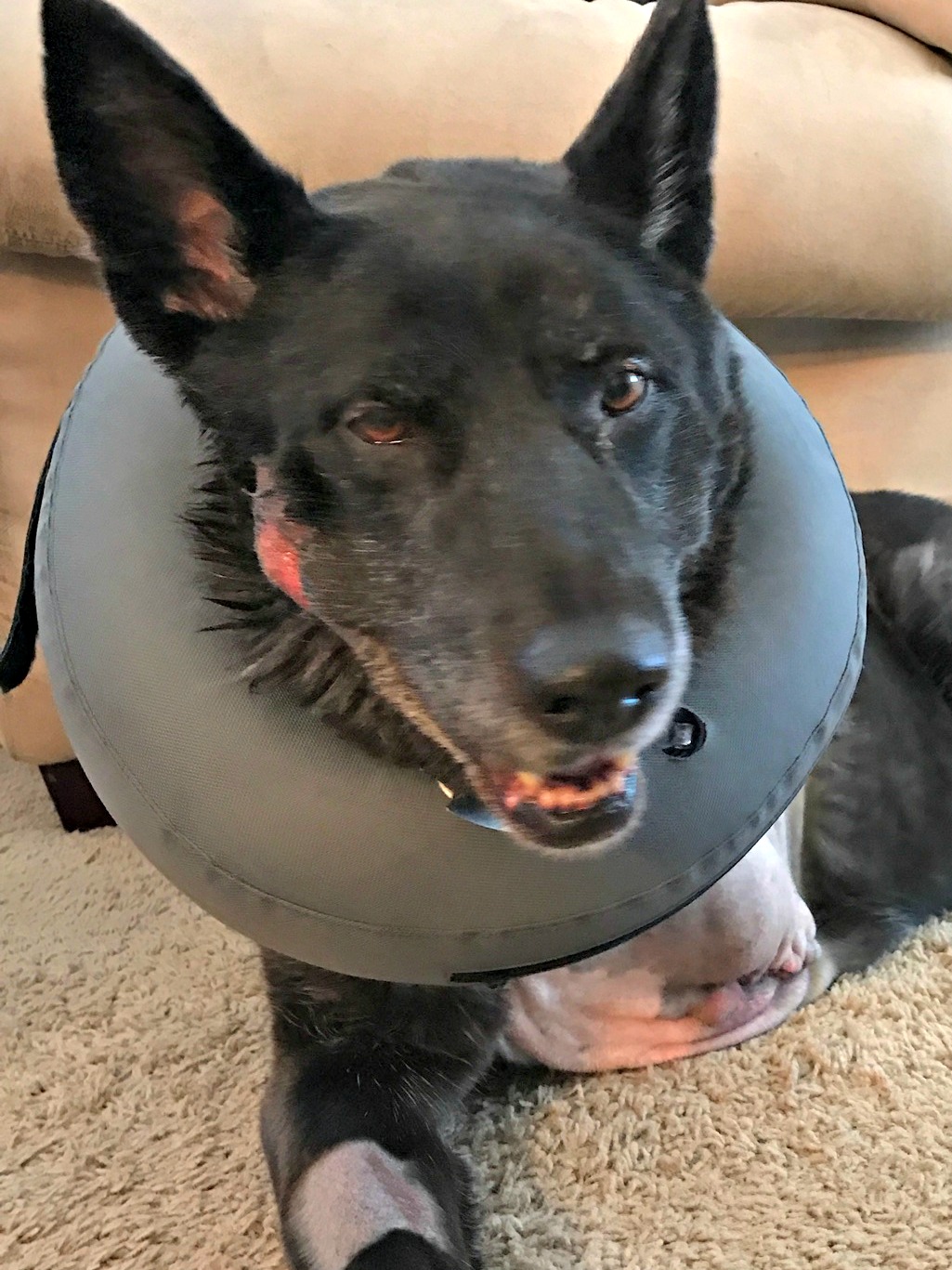 Recovery so far has been going ok. She is hard to contain and back to being ornery and playful. She refuses to stay still and is already a pro on 3 legs. We had a minor hiccup on Saturday when we woke up to the side of her face being full of a surface infection. I rushed her back to the vet and they ended up shaving her face and cleaning the infection.
