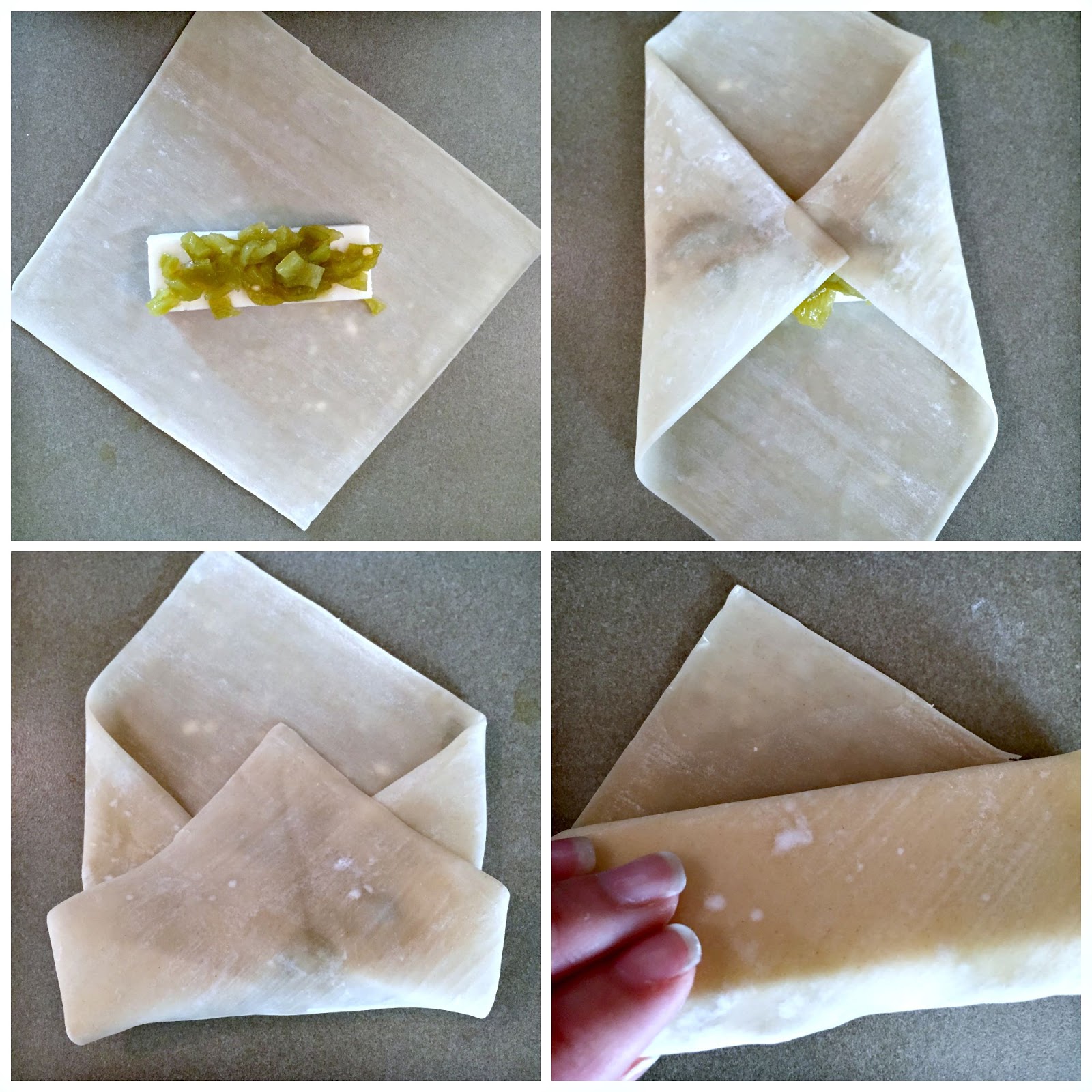 Diced Chili’s folks. It was what I had and it worked fantastic (plus the price point on the entire meal was 3x less than what we would have spent eating out). When I had went grocery shopping that weekend I snagged some Egg Roll Wrappers, Mozzarella Cheese and completely forgot the chili’s. Just has one of those spaced out busy mom in the grocery store moments. Luckily I had a couple cans of mild diced chili’s and so I winged it.