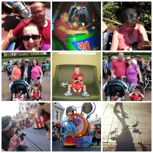 I tried to get a photo of the kids in their cute outfits each day, however, some days they just were not having it. Getting into the park that morning was relatively slow, apparently they have to take your photo for your ticket so they are non-transferable and that is a new process and they use iPhones for it so it was a slight pain. Once inside though we did the typical photos in front of the Disneyland gate and then headed straight down main street to Tomorrowland to meet my grandparents! This was the first time they would be meeting Emberlynn and my grandpa is such a kid my grandma could not tell him they were going until the night before they left because “he would drive her crazy”. They were a true blessing on this trip as my grandma is not a huge ride fan and she is a fantastic baby snuggler so Emberlynn always had shade and fully attention. My grandpa was able to get a mobility pass for our group so we did not always have to wait in huge lines with the tiny bossy infant girl and the wiggly impatient 3 yr old which made this trip SO much easier. Our first ride was the Buzz Lightyear AstroBlasters ride and Eyan LOVED it. He told us that he killed Zurg and was elated about it. We spent a lot of our day in Tomorrowland but we did hit up Fronteirland, and New Orleans too! While heading to the riverboat ride there were a group of ducklings and I just had to snap a photo…later on that evening while heading to the parade the ducks were on main street being guided by a cast member and I was walking back from the ice cream shop. The castmember stopped me and the little duckies walked right across my feet…SO CUTE! We ended the day with the parade which was cool, but many of the characters Eyan knew were not in the parade. Pluto did pick Eyan out and gave him “knuckles” which Eyan was happy with.