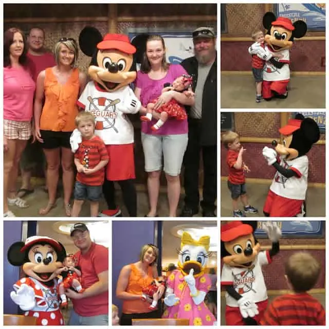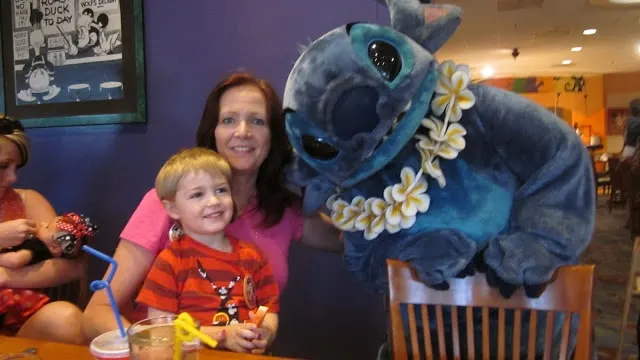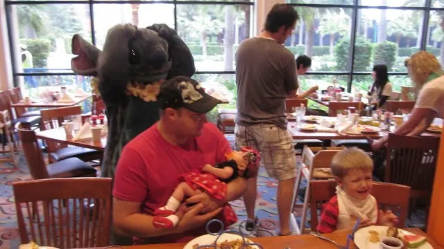 Seriously this was the one thing we did that set the entire tone for our vacation. Sure Eyan loved the plane ride and Downtown Disney, but meeting his favorite characters was exactly the way to start our Disney vacation. When you go in for breakfast they take you straight to Mickey for your meet and greet. Eyan was wide eyed and so excited. He high-fived Mickey, told him how old he was and hugged him. Eyan sort of was frustrated that Mickey was not talking back to him, but he got over it. All the characters LOVED on Emberlynn. They tended to stay around our table a bit more then others and just gawk at her adorableness. My favorite moment however was when Stitch from Lilo and Stitch came over and Eyan got scared…Stitches reaction was priceless. They became friends shortly after.