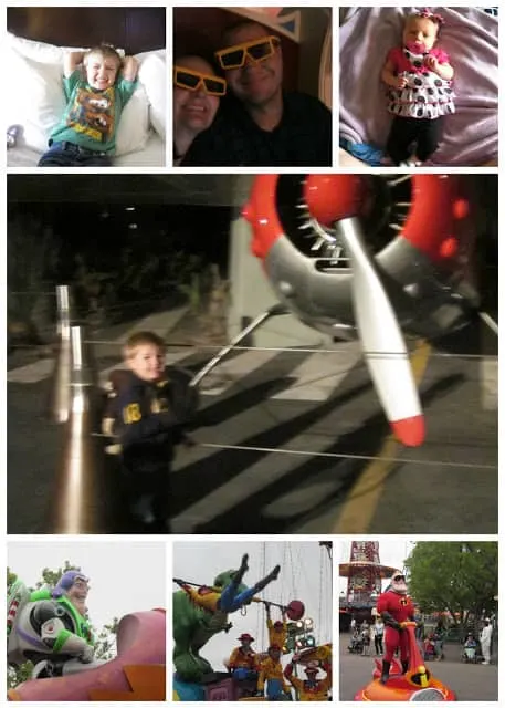This was one of those days where the kiddos were not going to sit nicely together for a photo. It was chilly that day and the day before was quite long, so of course it was a rough start to the morning. We were totally unorganized this day and truly it was a bit of a mess. I really wanted to spend the day in Cars Land with Eyan, but we got into the park late, the wait time for the rides in Cars Land was insane and on top of that Eyan decided to take a nap for a good 2 hours. So instead we headed to Paradise Pier where we quickly found out most of what is on the pier, Eyan is too small to ride, but we did get on Toy Story Mania which is a 3D ride where you play a bunch of Toy Story virtual carnival type games…I totally won with 94,000 points! We enjoyed just hanging out around the bay, watching the water show (which paled in comparison to World of Color) and eating ice cream. We also caught the Pixar Parade which was MUCH more interesting for Eyan and was the official spotting of Buzz and Woody. It was a bit of a bummer to find out that they do not have meet and greets with the Toy Story characters anymore…which I suspect is because of the whole “Andy’s Coming” photo floating around the internet. We ended our day with a nice dinner at Storytellers and then headed to Condor Flats where the adults rode Soarin and Eyan and I did some shopping and picture taking with planes! Day 2 was a bit of a bust, but hey, one rough day isn’t too bad.