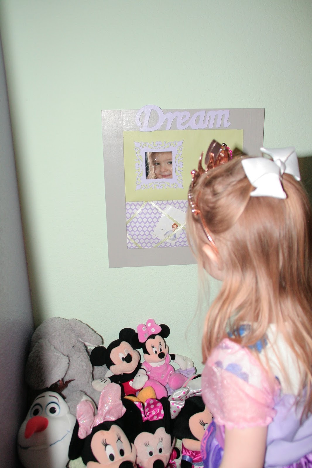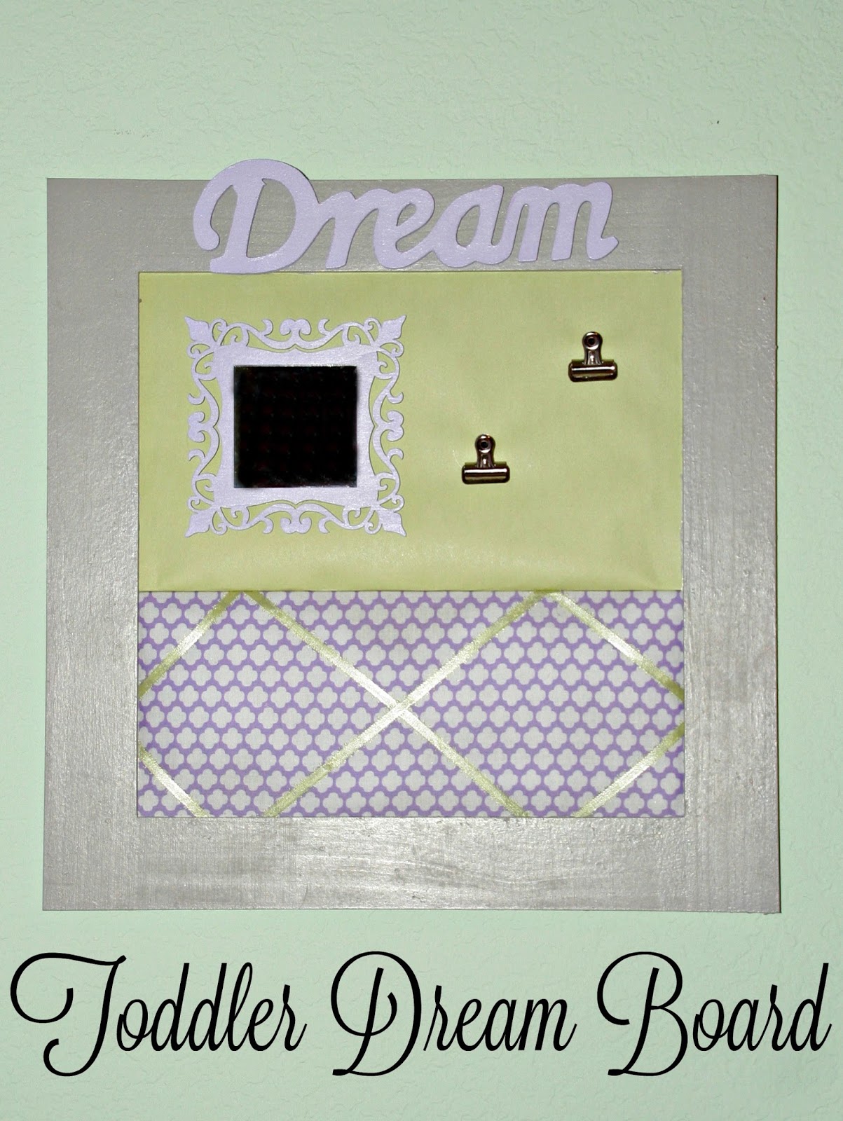 First I wanted to create a space in her room where she can play, dream and create. I thought a toddler dream board would be a good craft to add into her room. I have made nearly all of the decorative items in her room, and was excited to add this. I grabbed the items at my local craft store and got to work creating a little board that she could put stickers or hang jewelry on. I wanted a mirror that she could see herself in and a little space at her level that she could place her treasures.