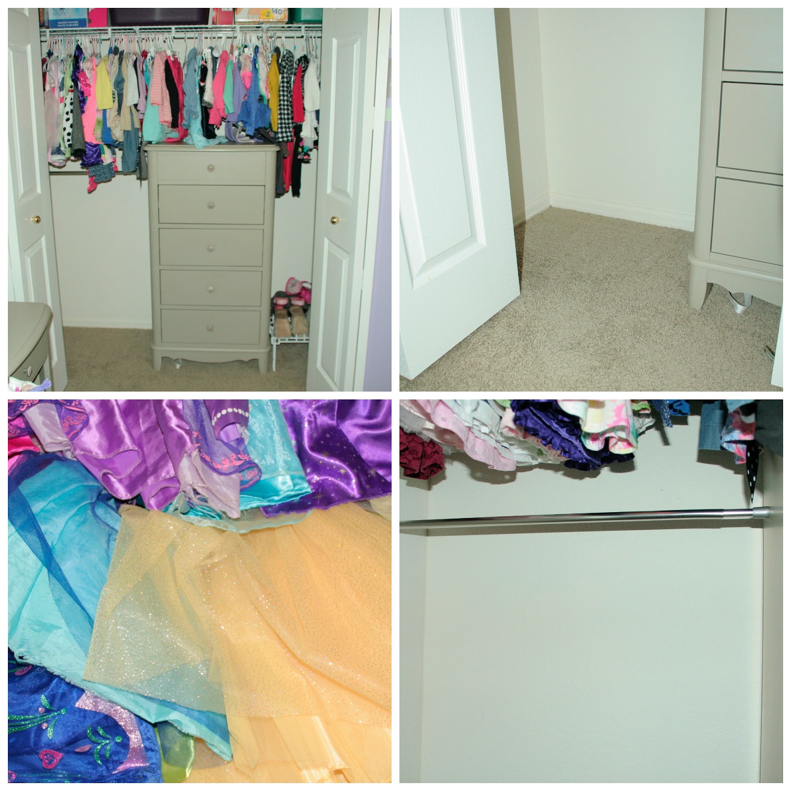 The problem: Space. Her room just did not have much. So I had a genius idea to utilize some closet space for the dress up station. I rearranged her closet and made a space in one corner that I thought would work great.