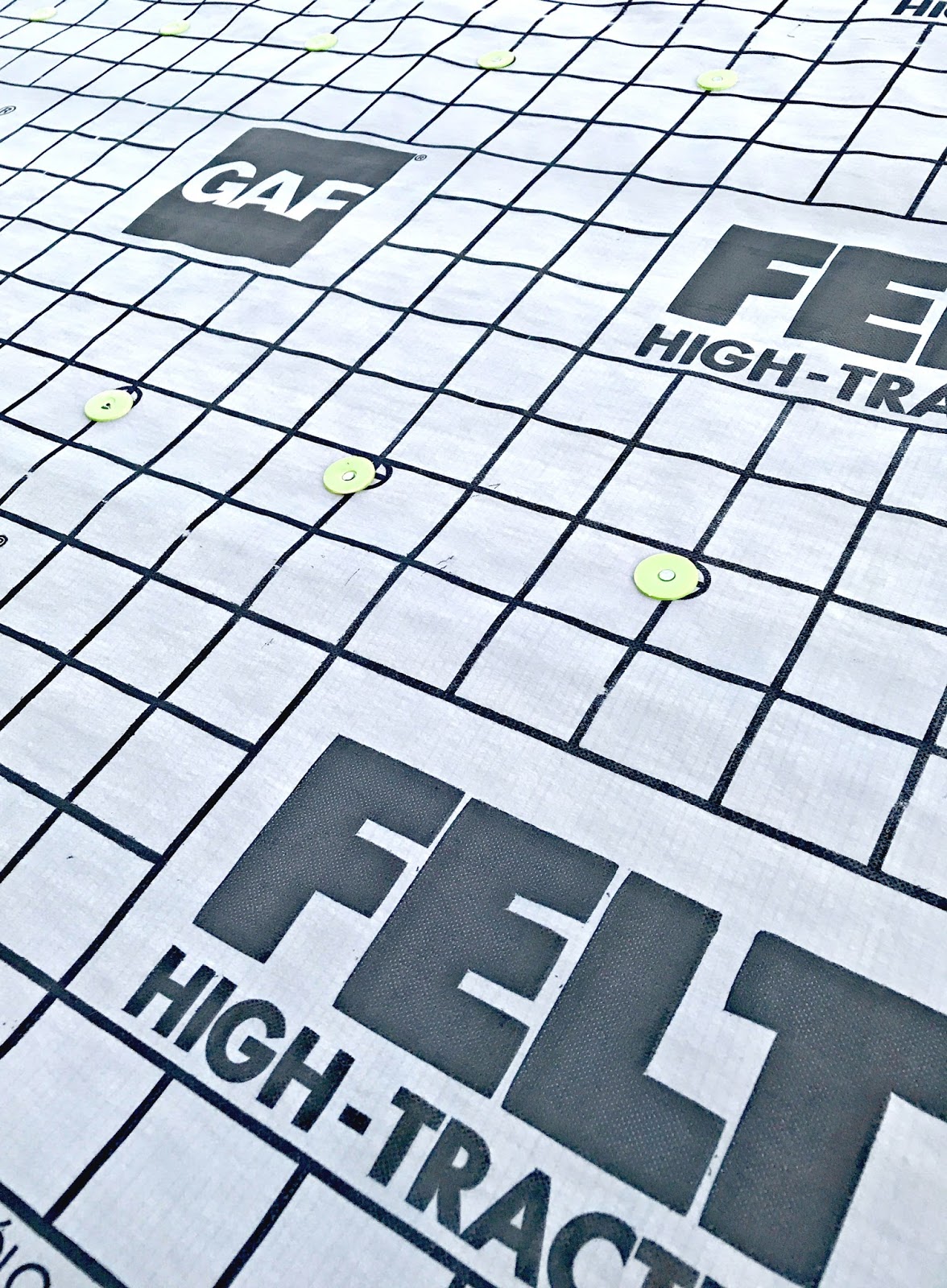 After the paint dried, we measured out the Feltbuster® roofing felt and got to work installing it. First, you roll out the felt on the roof, then cut it to have 3/4 inch overhang on the eaves and rakes. With the print up, you then use 1 1/4 round plastic cap roofing nails and nail in the roof decking following the wonderful marks that GAF put on the felt!