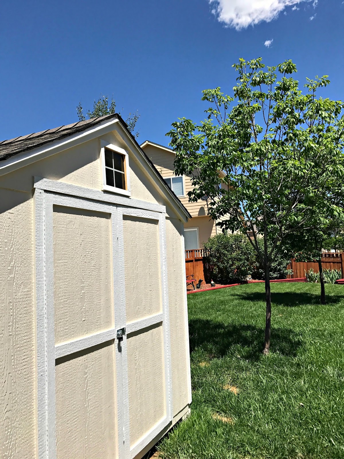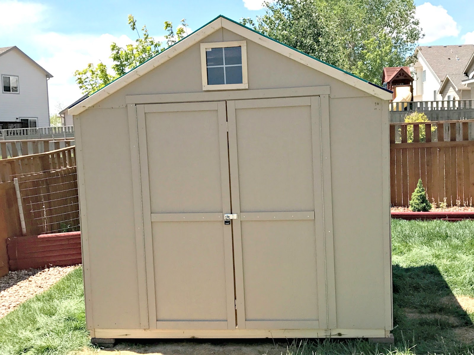 We then painted our shed according to our HOA specifications. We matched our house exactly, which was easy since just last year we had to get our entire house repainted and re-roofed from a massive hail storm. Now we know the exact color of our house and shingles and we LOVE it. We did hand roll the paint on the drip edge, although it totally looks sprayed on. Not sure why it did that, but it looks cool.