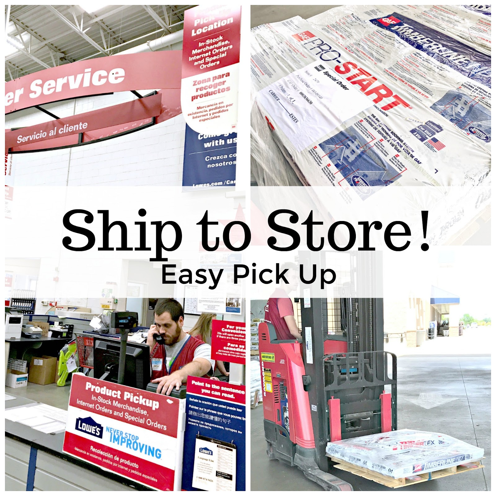 We ordered 3 bundles of Timberline HD® shingles, 1 package of TimberTex® Premium Ridge Cap Shingles, 1 roll of Feltbuster® High-Traction synthetic roofing felt and 1 package of Pro-Start™ Eave/Rake Starter Strip shingles and had them shipped to our local Lowe’s store. Ship to store was super easy. I picked out what I wanted online, paid and waited a short time for a call to come pick up our order. We went straight to customer service, where they called the order up, then they loaded it onto a forklift and into our truck! We had the last of our supplies to complete our project and were totally ready!