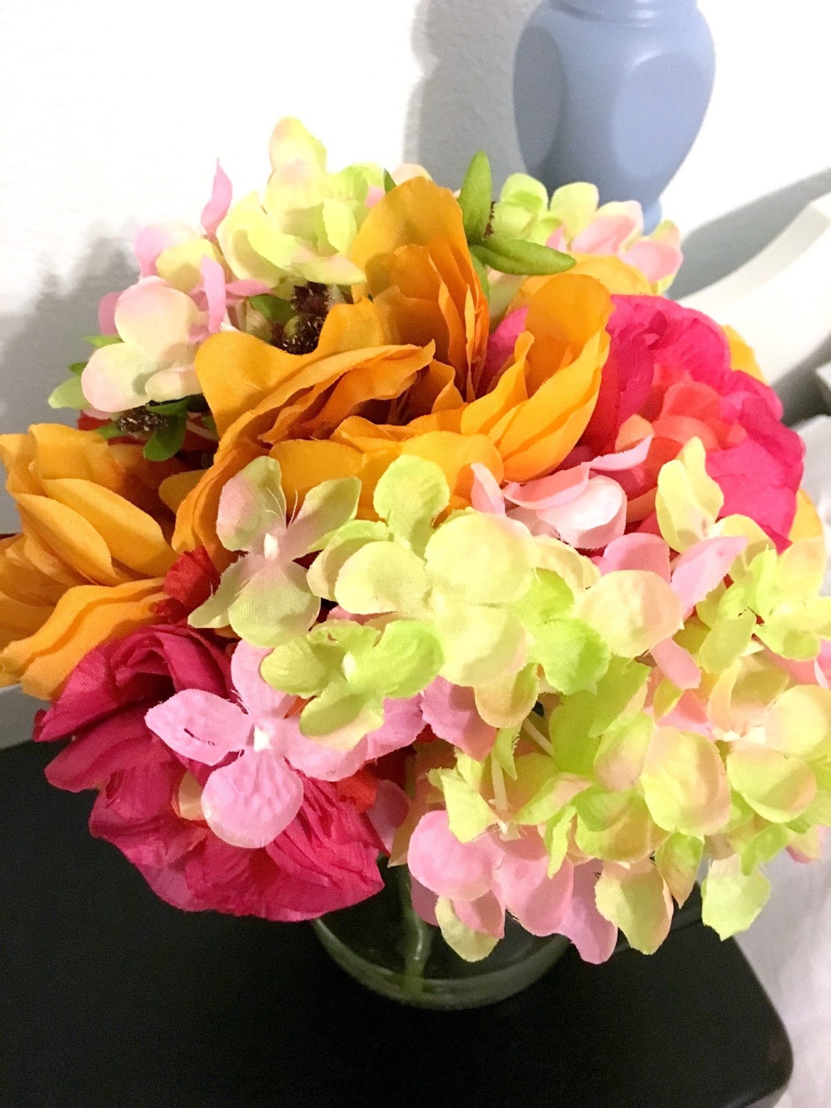 I had a $50.00 budget and really did stick to it and snagged some beautiful items. Our basement is very bland and although there is color on the walls, it is moot. As in the wall in the picture below is blue, but it looks white. I decided to go for some bold pops of color in the decor.