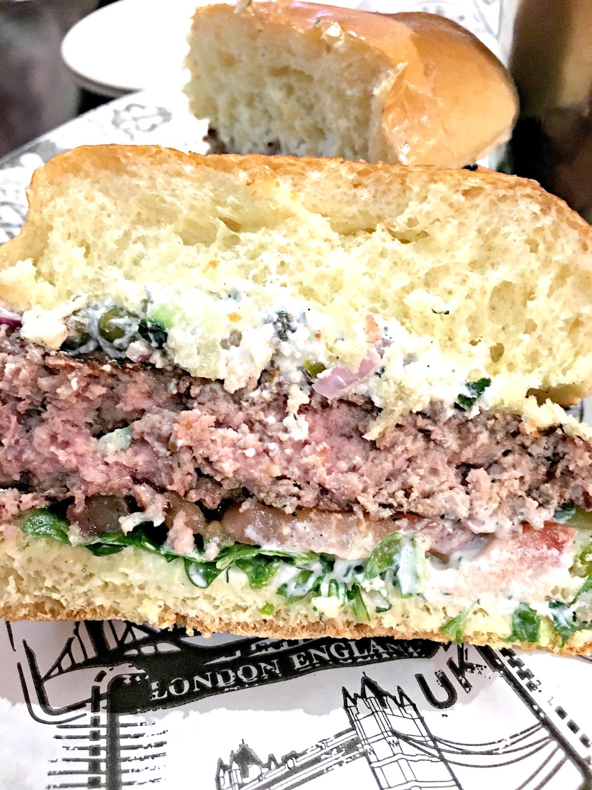 My favorite was the Greek Burger from Greece. This has a fantastic mixture of feta cheese, capers, olive, red onion and peppers, with Tzatziki sauce. I am a lover of greek food and could eat this burger every single day. It was so flavorful and creamy. I truly enjoyed this burger and was very impressed with the Tzatziki sauce for our french fries as well. So scrumptious.