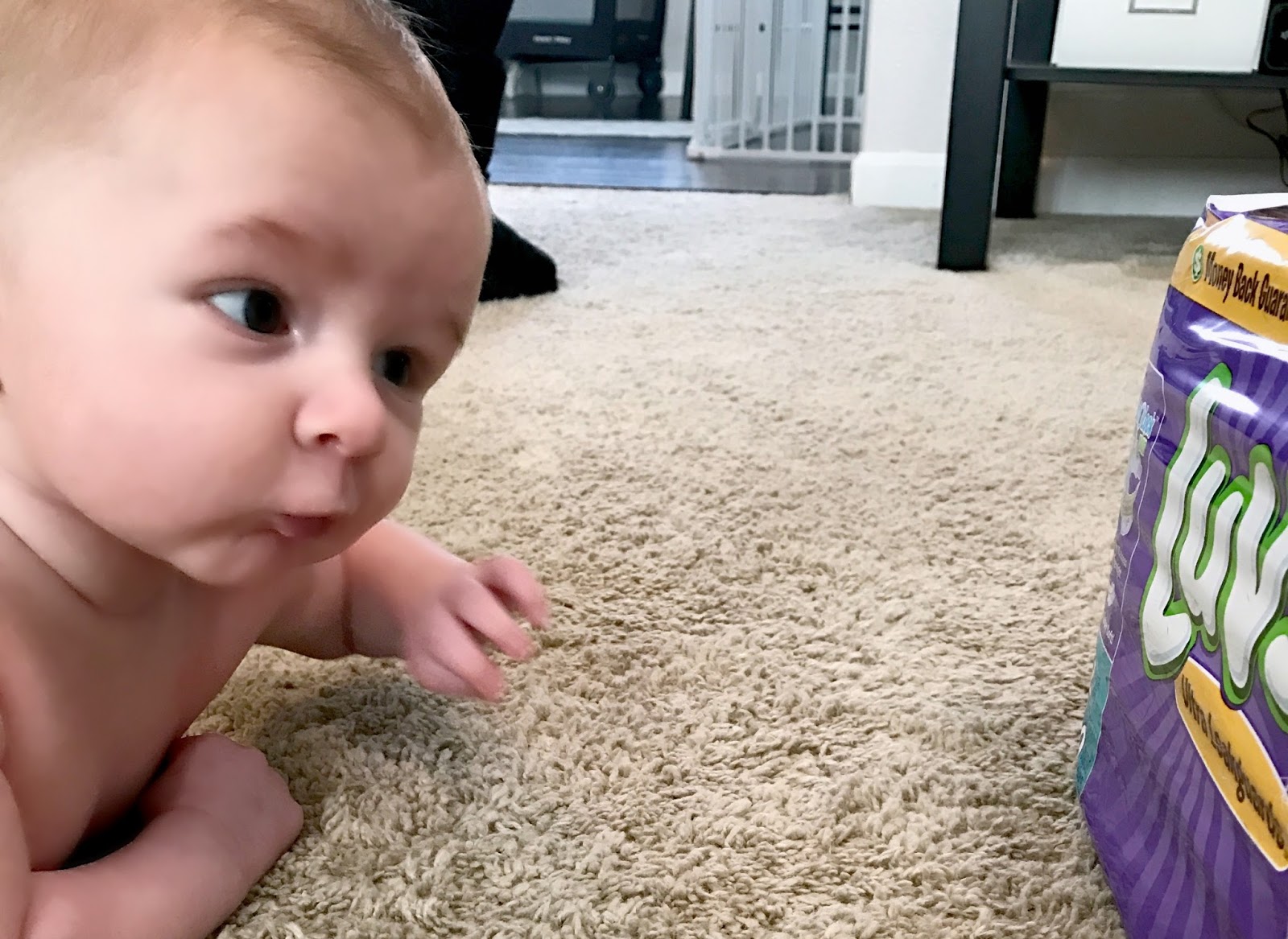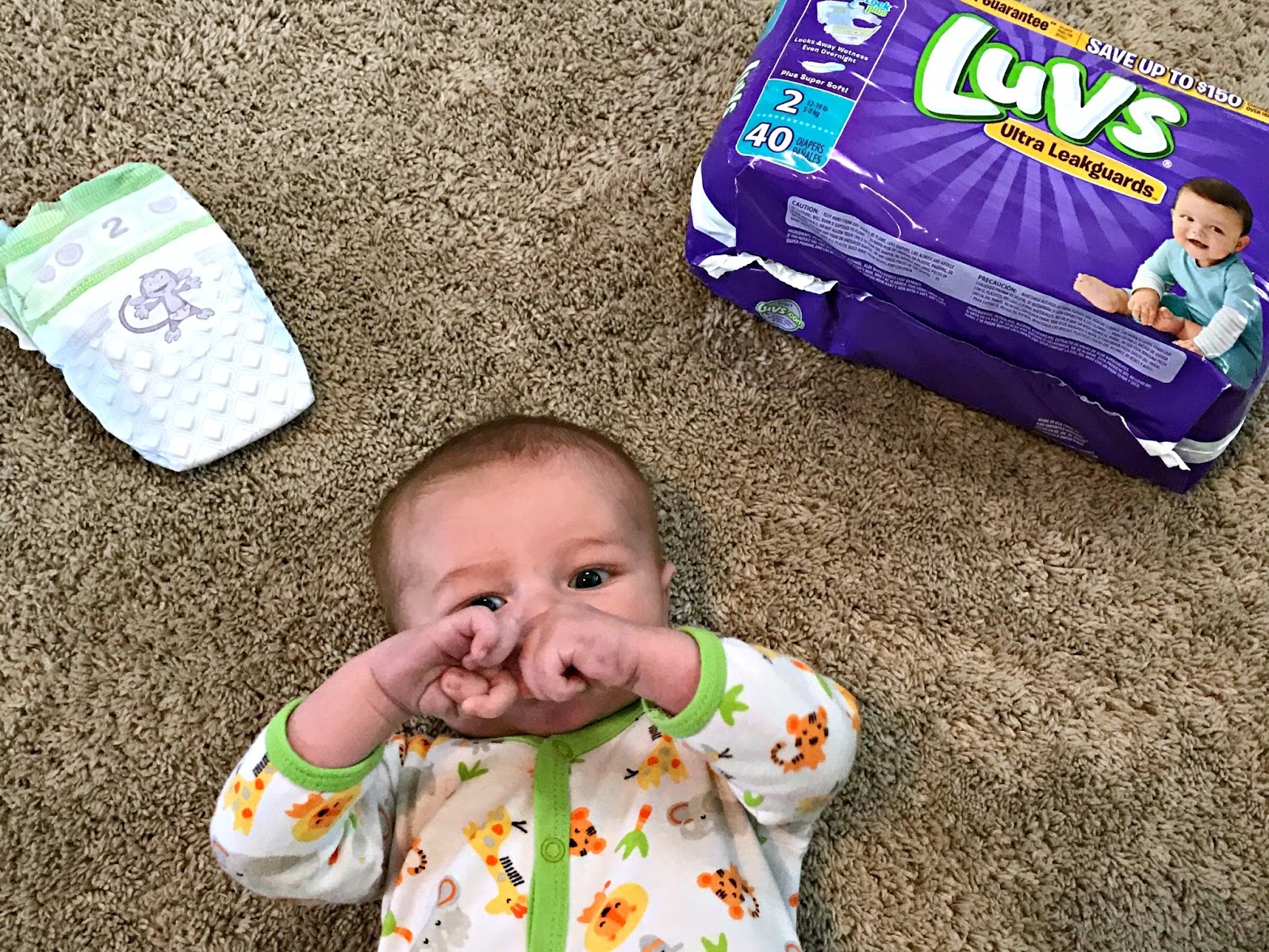 He is learning to roll over and is getting great head control and trying to reach for things. My daughter placed this package of Luvs diapers in front of him and he was absolutely fascinated with the colors and baby on the packaging. He kept trying to reach for the packaging and was super cute to watch his little concentration faces.