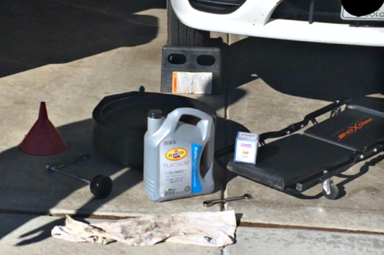 Funnel, Oil catching Basin, Filter removing wrench, old rag, new oil filter, Pennzoil Platinum Full Synthetic Oil, car ramps, wrench for drain plug, safety gear.