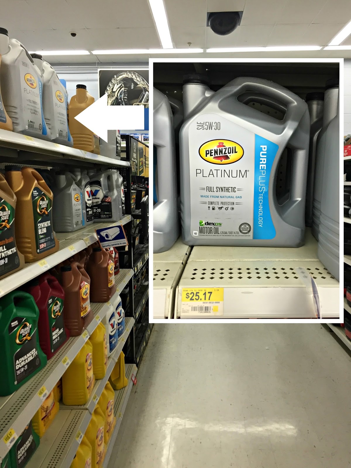 Had I known then that this responsibility would save my life in a car accident, drive us well over 200,000 miles and become a part of the family, I don’t think that car payment would have been so alarming. Regardless, that little car is family and is now my husbands commuter car. The car still gets well over 30 mpg, but is getting old and burning oil. So after consulting with my mechanic dad, we decided to switch to a full synthetic motor oil to hopefully extend the life of my beloved little car. So off we headed to Walmart to grab the best oil we could find.