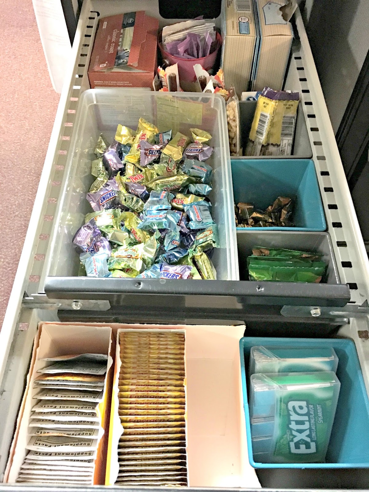 We are 3 days from Spring Break in our building and things are getting tense. Our spring break is a full 2 weeks overdue compared to previous years, and both students and teachers are getting restless and stressed. When teachers are stressed, we snack and many times our snacks are not always the best. So I decided to Give Extra, Get Extra and renovate our “Good” drawer to bring some healthy and sweet options to combat these stressful times.