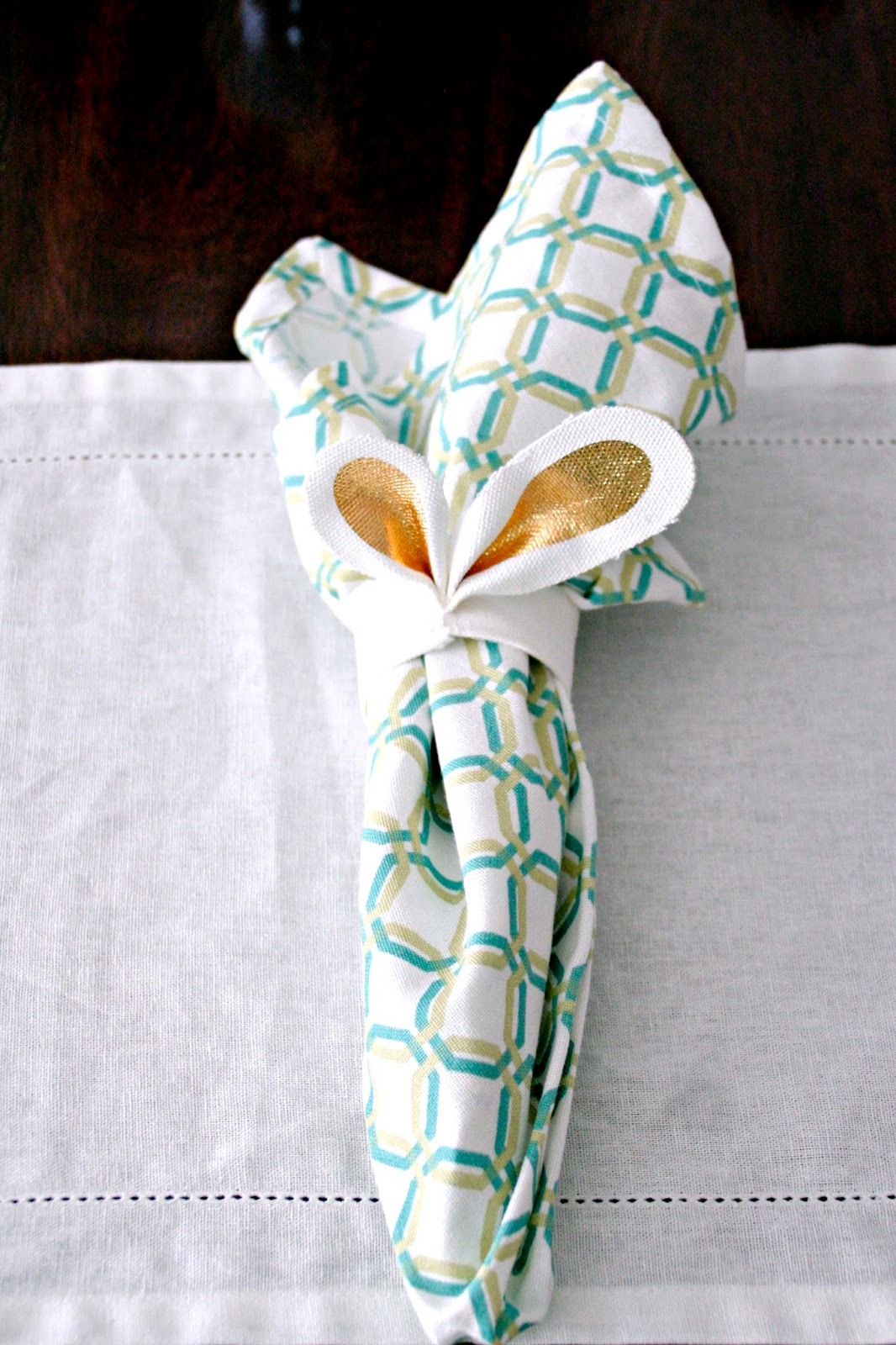 These bunny ear napkin rings are my favorite. Gold and adorable and a steal from the Target Dollar spot. I paired them with these bright napkins that I bought a while ago at Kohl’s and put them on these white placemats from the Target Dollar spot.