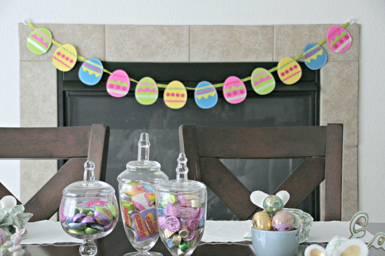 The Easter Egg garland was another fantastic Oriental Trading find. I like to decorate our fireplace, and you can see what I did here, but we have a two-way fireplace and this is the other side. Putting up a mantle would not give us much walking room, so I love adding a little garland to bring this feature that we love to light in both rooms.