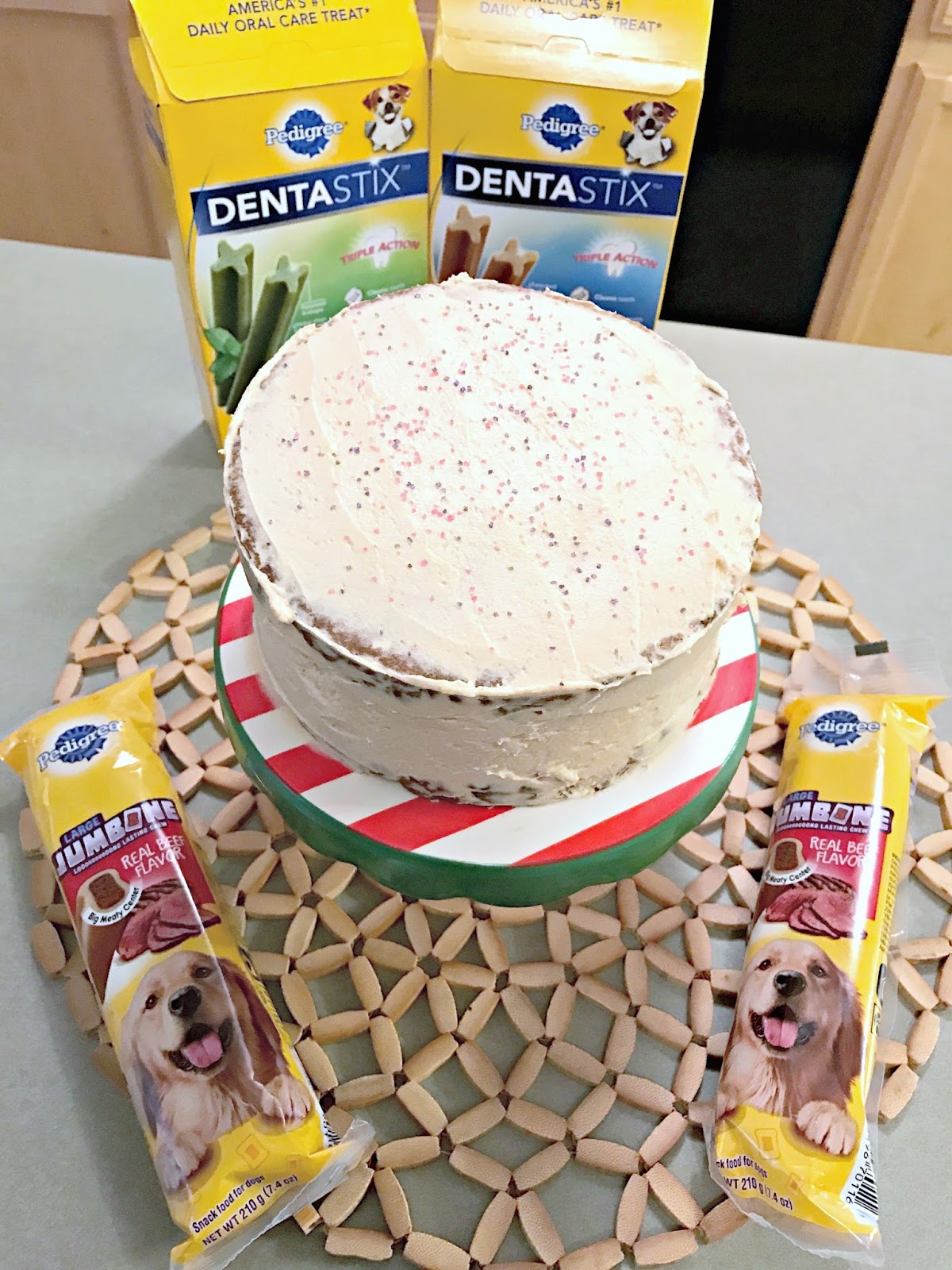 I first headed to Walmart to grab her favorite snacks. The PEDIGREE® JUMBONE™ and PEDIGREE® DENTASTIX™ are an absolute favorite for our pups. I also grabbed the ingredients to make a puppy safe cake. I found a recipe for pumpkin dog cake online and it turned out great. The frosting is a yogurt peanut butter mix and our girls scarfed this down! I baked the cake as directed and set up Mia’s birthday party and treats for our first holiday celebration!