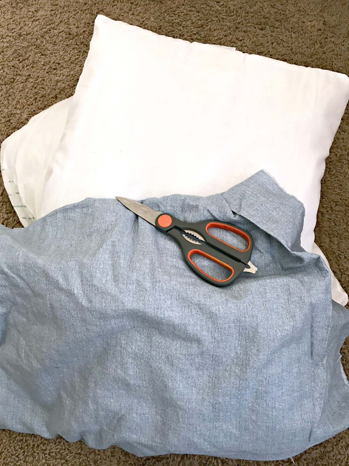 - Then I laid the two pillows on the folded sheet and cut the sheet to fit the pillows. I left about 5 inches on each side of the pillows so I could tie those together.