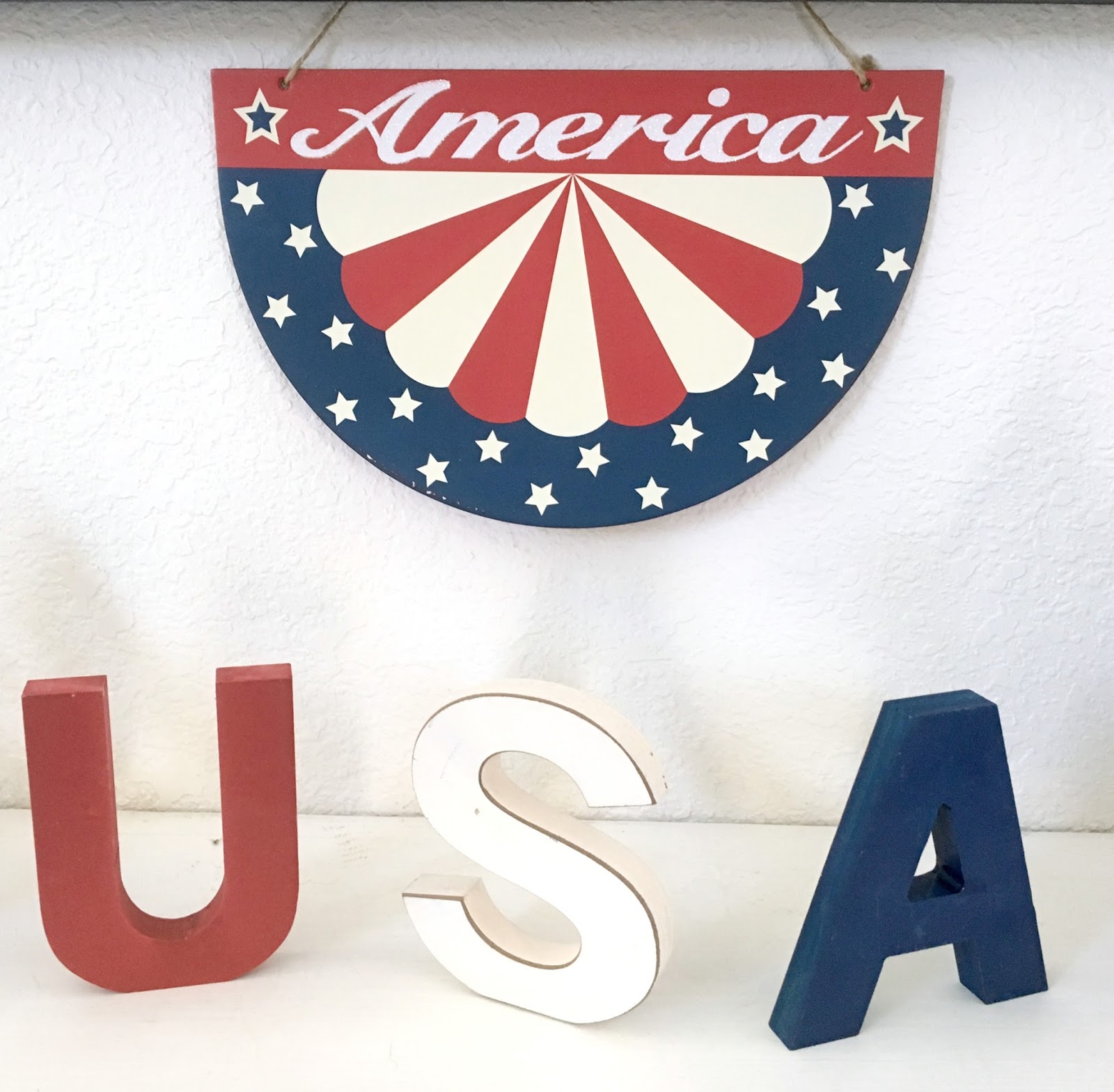 I adore the USA letters and for $3.00 at Target, they were hard to pass up. I also found the little wooden America bunting at the Dollar Tree!