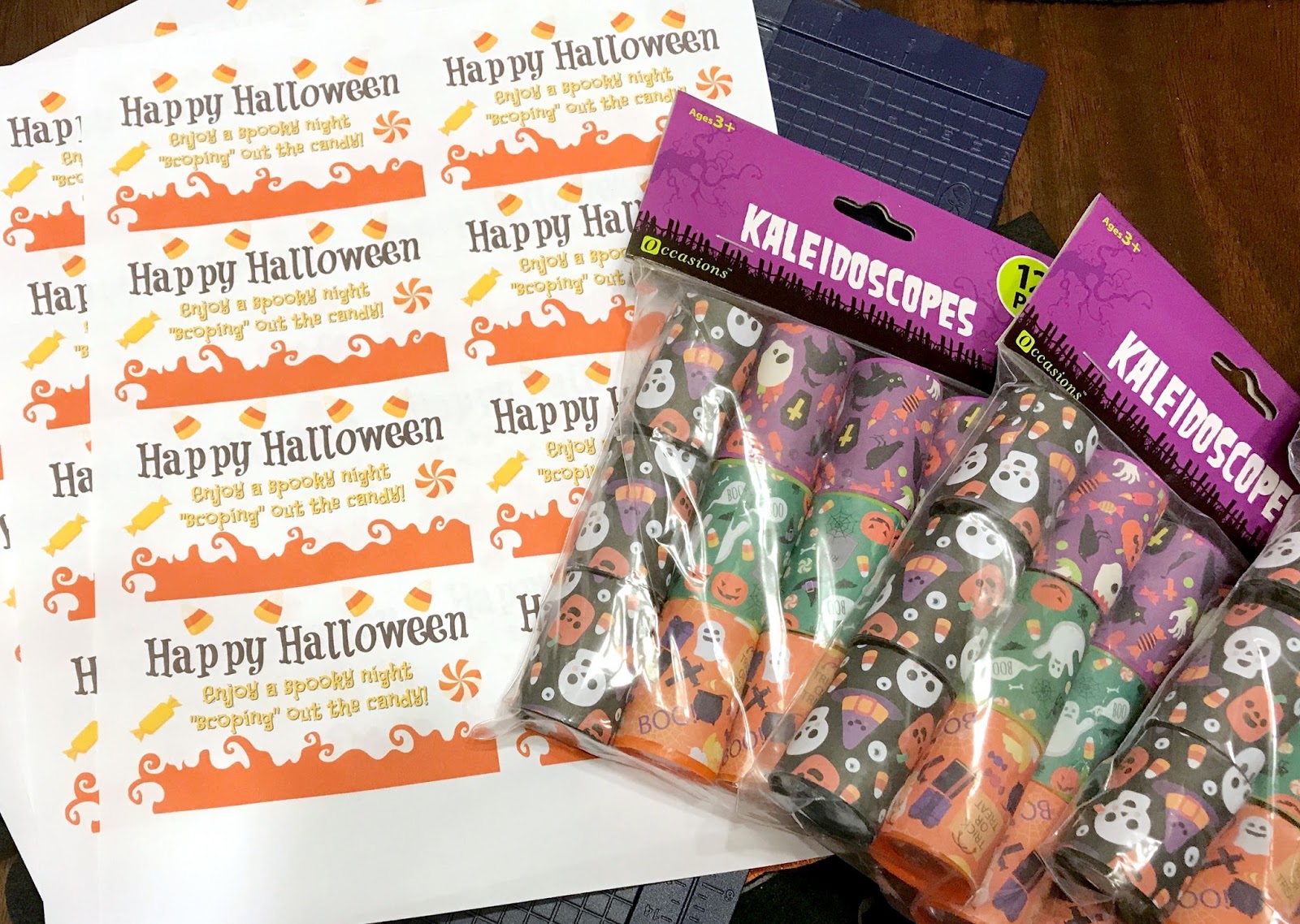 Kaleidoscope trinket toys are a party story staple. Our party aisles have them always and they do not have to be Halloween themed to make this work! Just grab a couple packs, head home, download my printable and get to work! You can have this complete in about 10 minutes!