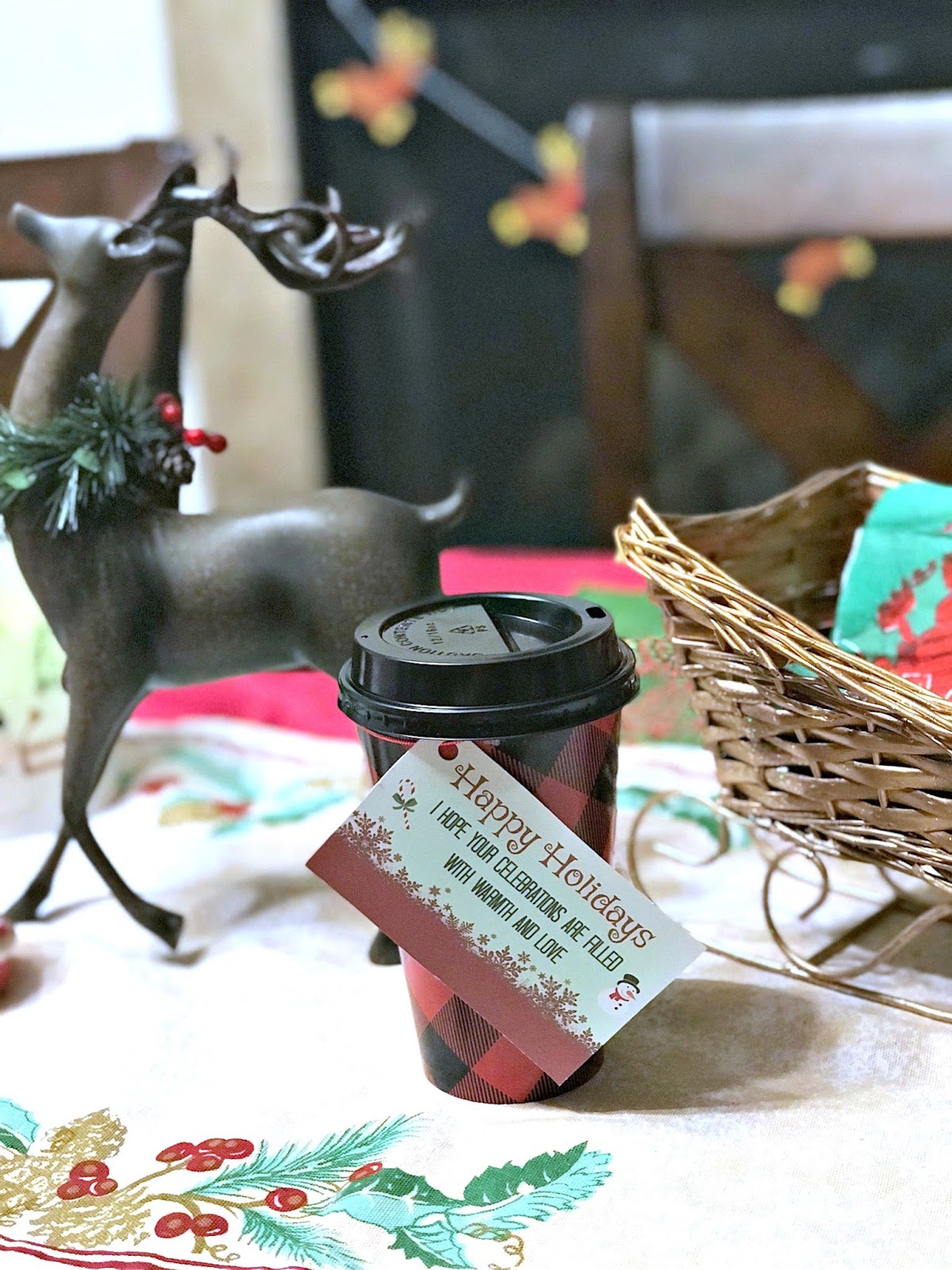 The hot chocolate to-go cup is easy to put together. Simply, just add a package of hot chocolate mix, snowman fluff marshmallows, a peppermint spoon and if you want a few pieces of chocolate too! Then tie the gift tag and add the lid! Super easy and cute too!