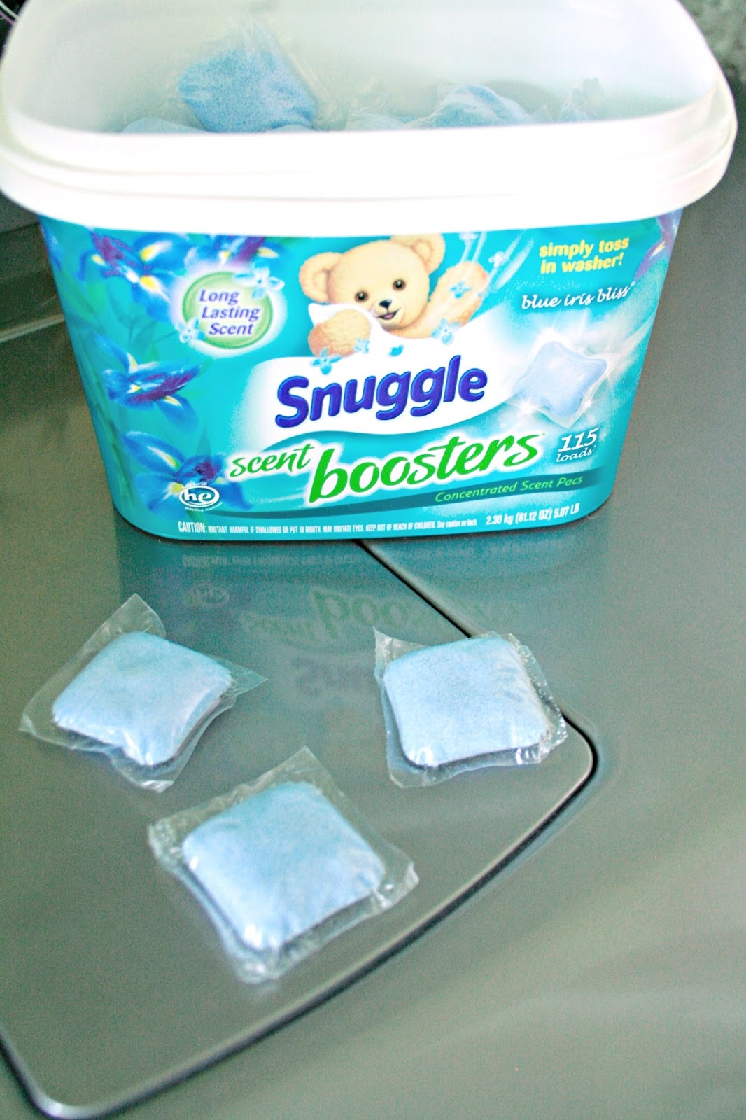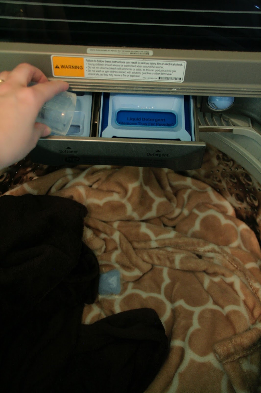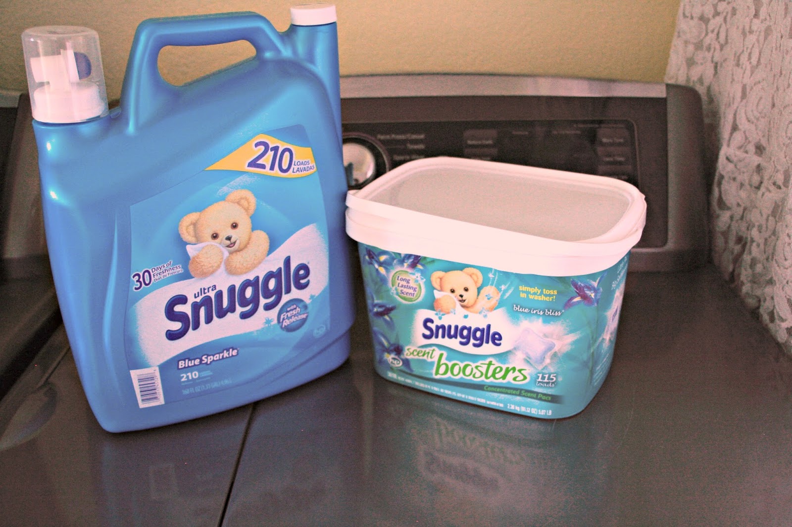 We got home from our shopping and I grabbed our living room fleece blankets and put them in the washer. I poured the Ultra Blue Snuggle® Fabric Conditioner into washer dispenser and then threw a scent booster in with the loosely packed blankets.