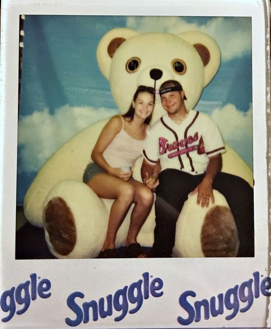I was inspired to create this Snuggle® themed popcorn bar from our first anniversary together. The husband and I headed to grab a movie from the local movie store and then to get some items to make dinner and some popcorn for the movie later. We headed to the grocery store that evening and in the middle of the grocery store was this HUGE Snuggle® bear and a photographer. We decided to mark our first anniversary with a fun photo and to this day this photo is framed in our room.