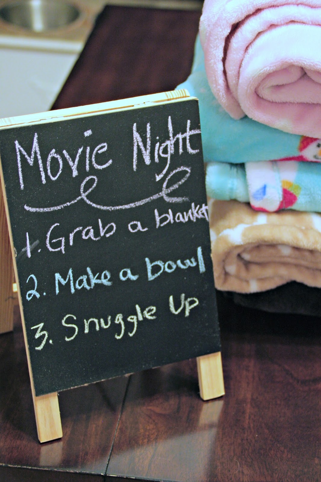 When the blankets were finished, I folded them up and sat them on the table with a fun little chalkboard sign to direct my family through our little popcorn bar.