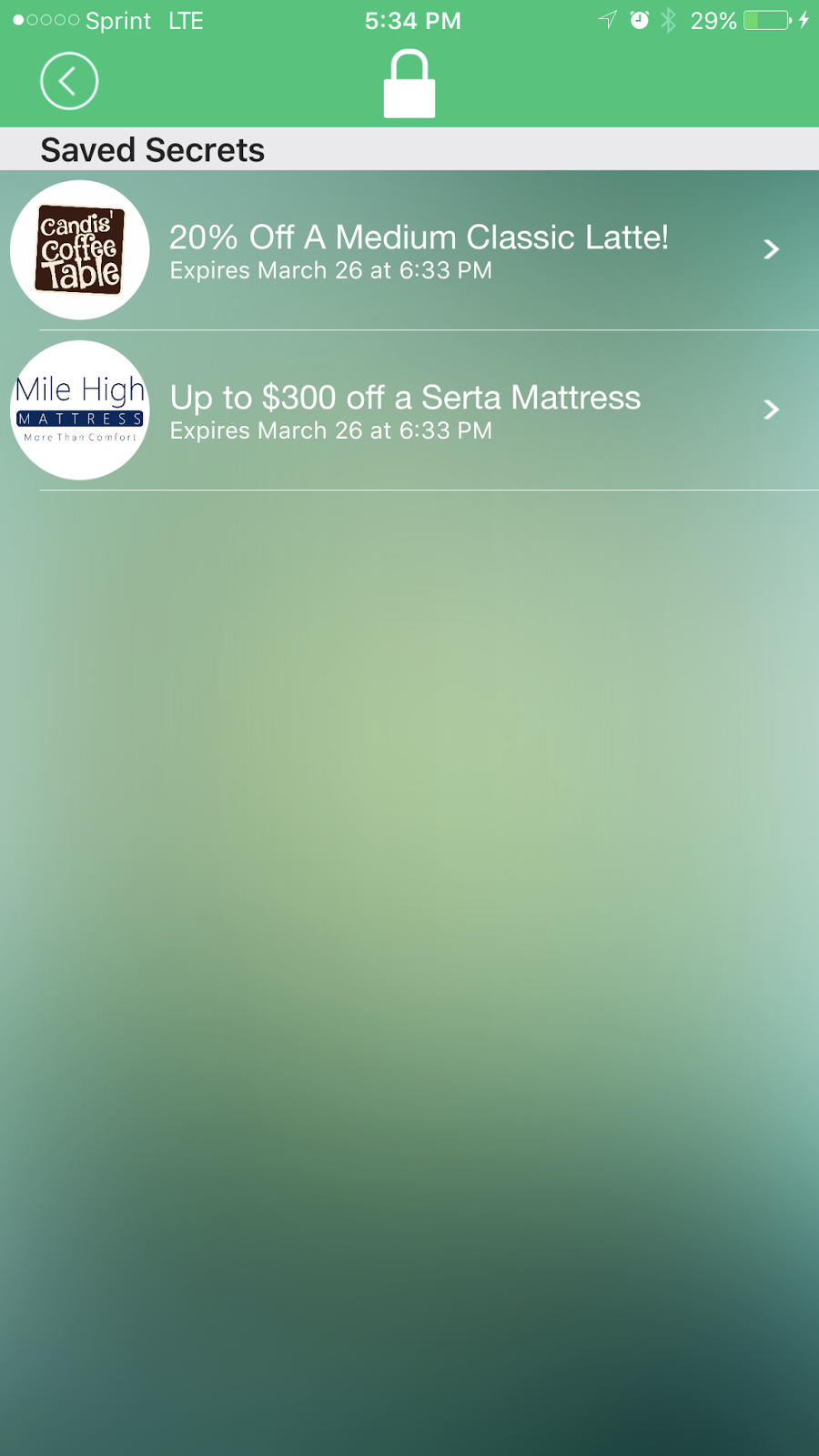 I then navigated to the secret offers section of the app to see what those companies secret offers were. I opened them, took a peek and decided that I wanted to keep the secrets in my vault. Cyphr is really a wonderful way for you to support local businesses and also try new things out in your area! I for one am very excited to try out a new local coffee shop and save some cash while doing that.