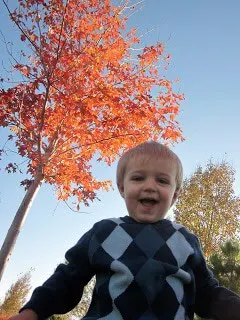 Eyan was less than cooperative with this and I really wanted the changing leaves in the background so I finally just laid down and with a crappy ol’ point and shoot took about 50 photos of him running around me and jumping on me. I just love this picture!