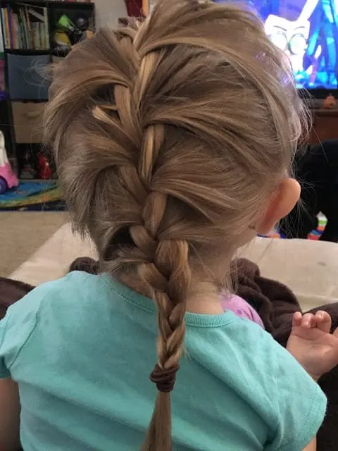 Not only have I been getting crafty with costumes, I have been getting crafty with hair. Lately I am bored with my hairstyle. I have been trying a few different things in the mornings that are both easy and cute. I really like this sock bun and received a lot of compliments. The peanut has also been letting me play with her hair more and I was able to do this full french braid. I cannot believe how long her hair is getting.