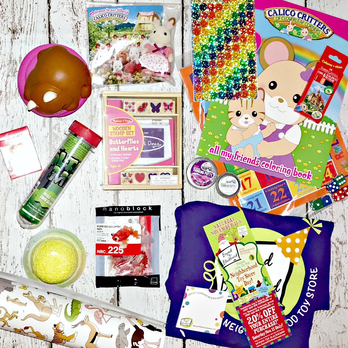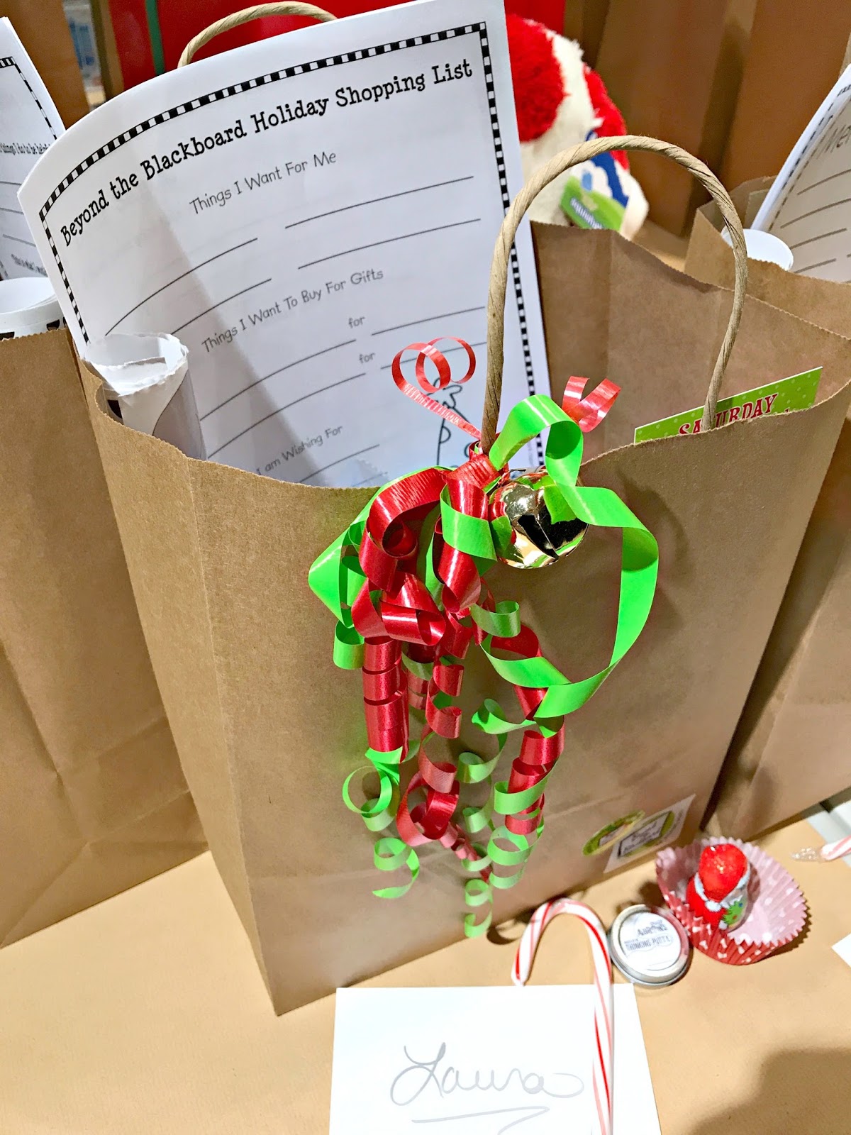 The last couple games we played were Happy Salmon (which I lost) and then a fun white elephant gift exchange featuring their top sellers in the store! Fun Fact, Beyond the Blackboard gift wraps all the items purchased in store with a ribbon and bow! It was super fun playing and learning about the toys and how they help with learning and motor skills and having a little competitive fun while we were at it! When the game ended, there were still 3 gifts left in the center pile. The winner of the stocking stuffer contests would each get a 2nd gift! Well guess who won!