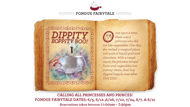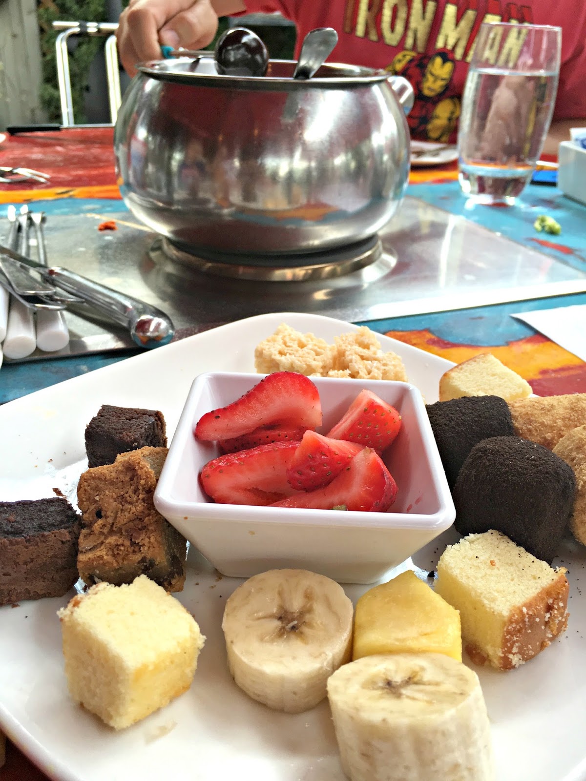 We were so lucky to have been asked to enjoy this day and my kids are still talking about how much they had fun. The price was just right at $35.00 for each adult and $14.95 for kids 4-12 (little ones 3 and under are free). Reservations are required and are taken from 11:00 am to 2:30 pm. There are 3 more Superhero Sundays scheduled through this summer and for those of you with little princesses and princes, there is also Fondue Fairytale offered as well!
