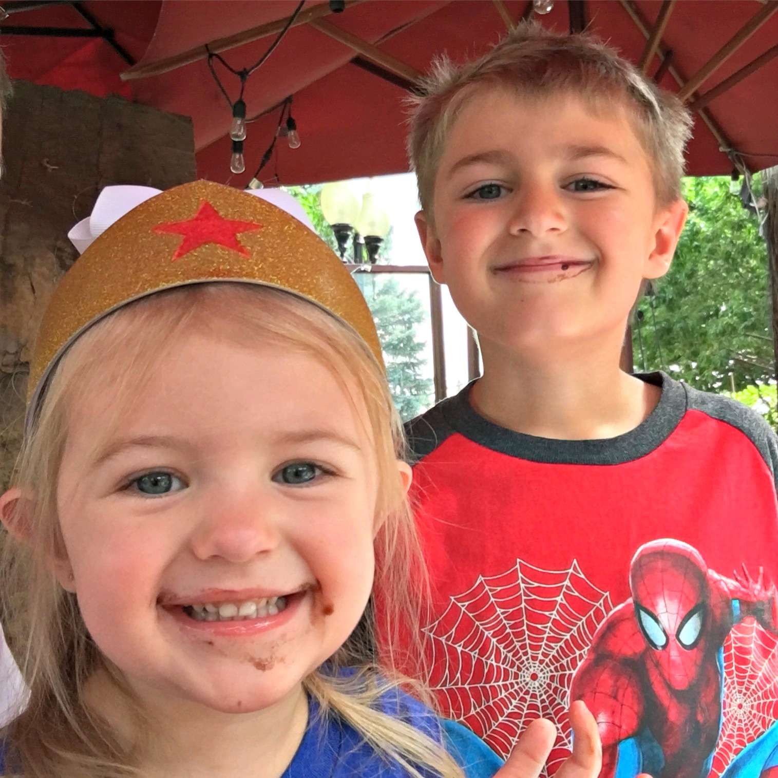 Their happy chocolate fondue faces say it all! Oh and that Wonder Woman tiara the princess is wearing is still on her head, 2 days later. She absolutely loves it! The Melting Pot in Littleton really outdid themselves with their hospitality. Not only was the food fantastic, the staff impeccable, but the atmosphere was fun with the music, games, dancing and entertainment. They also had face painting. My kids do not like getting their faces painted (weird), but every other kid there was loving. In addition, they did such a great job focusing on the kids and making them feel like this was their place to relax, have fun and enjoy a special time dedicated to fighting crime and enjoying life.