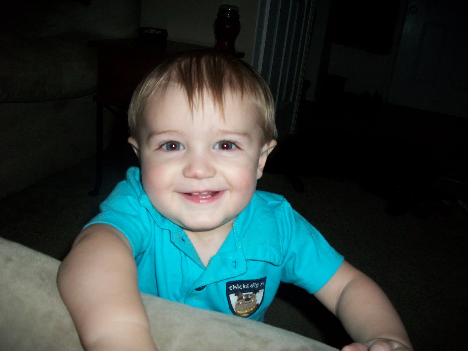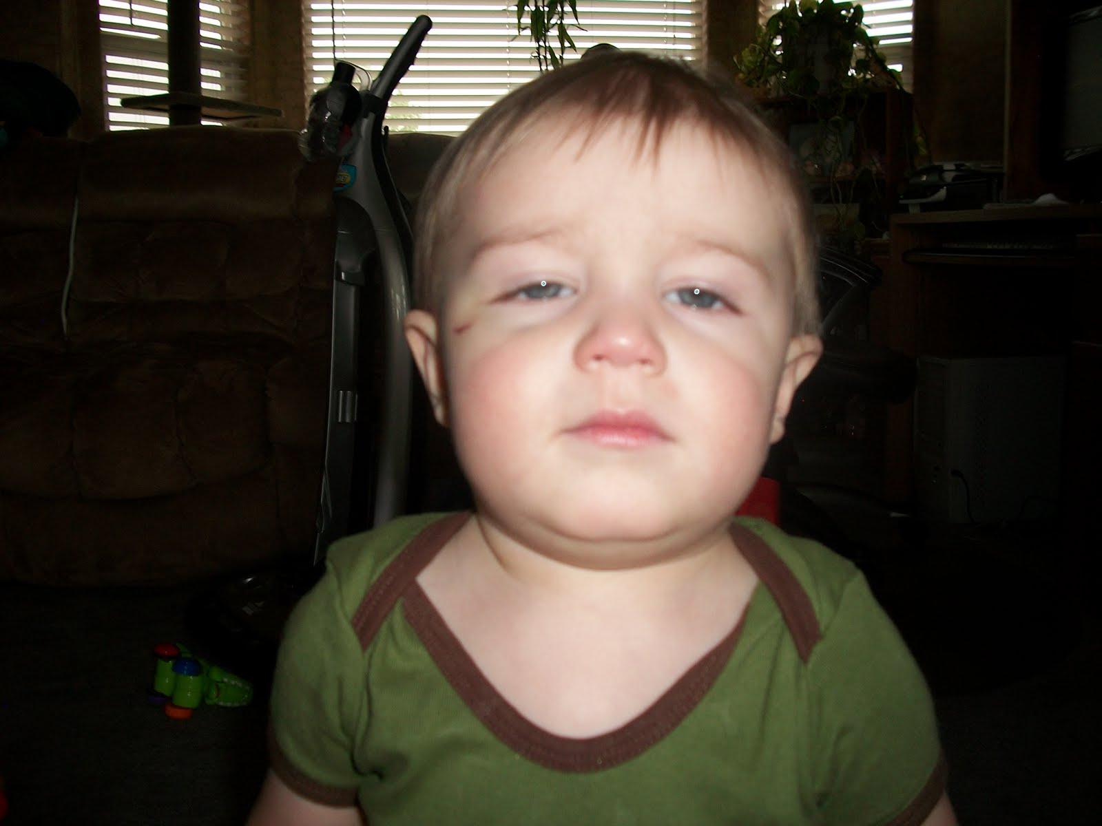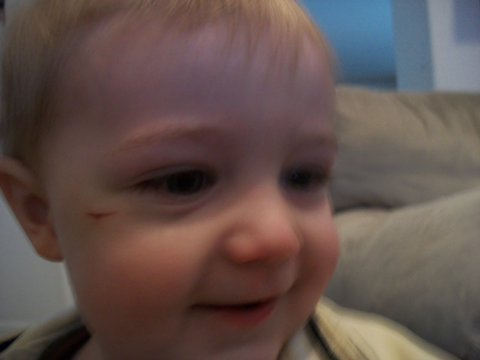 Advice Tid-Bit #1: Baby Proof NOW!–Jason and I were kinda up on this. We had put those electrical plug covers in, did the baby gate thing, cupboard locks and made sure all those sharp corners were covered with these stupid plastic things that did not work. Eyan preferred to chew on them and we sort of gave up on the corner protectors. I was following him around and making sure that he did not hit that precious little head on any sharp corners. That works great around my house…not so great at Grandma & Grandpa’s…at their house, he tripped over the dog and landed square on the sharpest coffee table corner EVER!