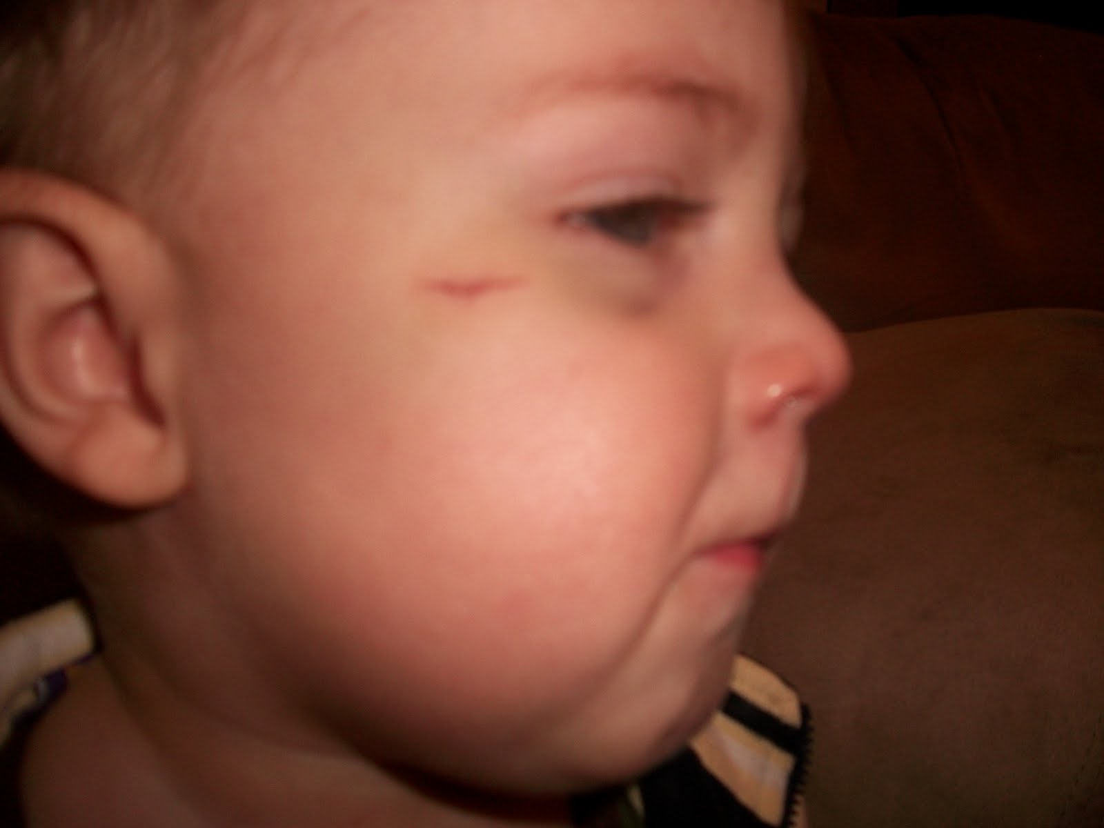 Advice Tid-Bit #2: Never take your Eyes off them!–Yeah you would totally figure after exhibit A that I would be on my little mommy game…WRONG! The last few weeks of any teachers school year are exhausting and mine was no exception. As I was hanging out on the couch being lazy, Eyan and the dogs were just playing and playing and playing. Eyan was right in between them, they both moved, spun him around and WHACK there was the most terrible looking bleeding-black eye I have ever seen on a baby.