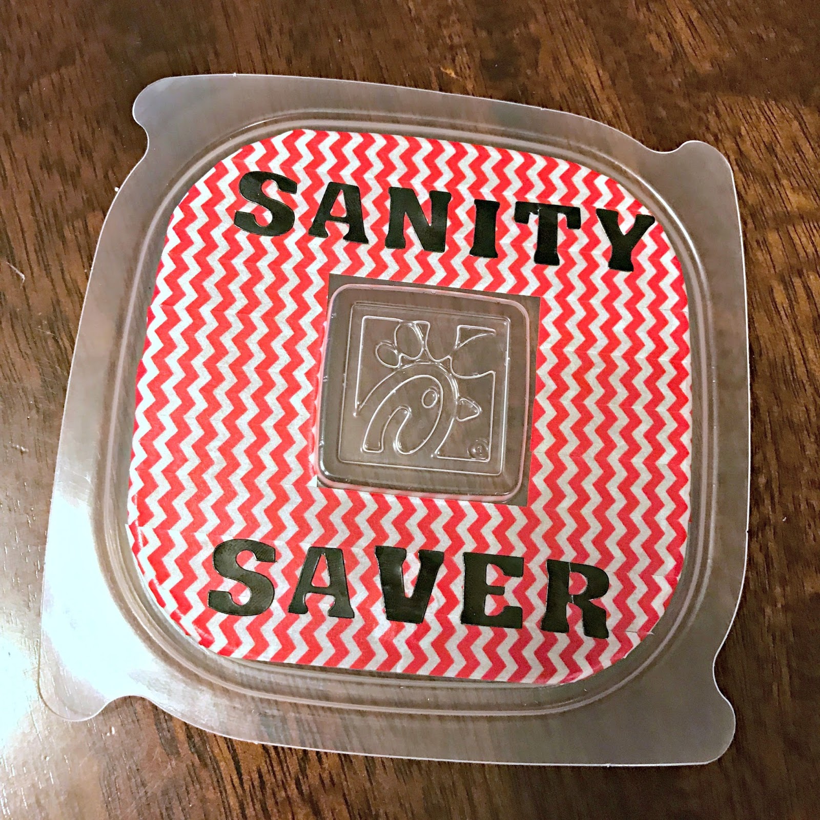 Next I used some old scrapbooking stickers to add the words “Sanity Saver”. In hindsight, I would have rather used my Silhouette to make vinyl words that were a bit prettier, but I was doing this quickly and grabbed what I had.